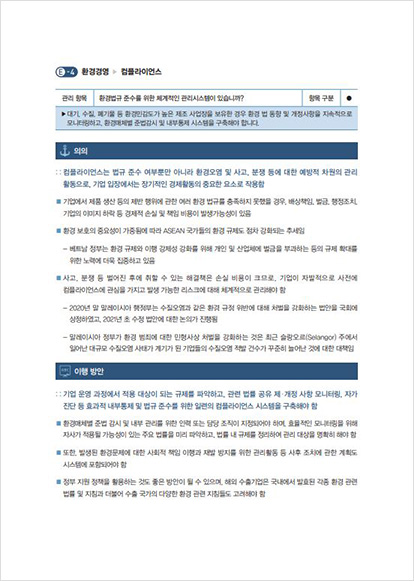 To enhance business and investment opportunities for small and startup enterprises with limited understanding and utilization of ESG (Environmental, Social, and Governance) criteria, ASEIC develops and provides ESG management guidelines and checklists. These tools aim to internalize ESG practices, introducing management topics, implementation strategies, and case studies beneficial for domestic SMEs, mid-sized enterprises, those expanding into ASEAN, or aspiring to do so.