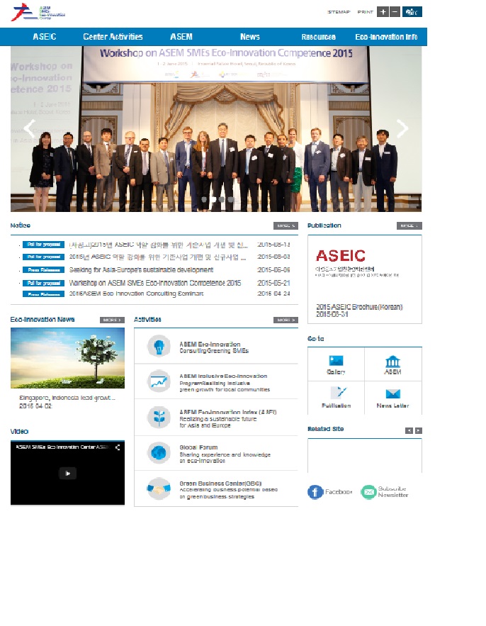 ASEIC re-opened its homepage with new design. We tried to consider the user’s convenience in design and changed the form of menu with uniform blue color and orderly icons. The first page of the previous homepage was more packed with a whole lot of information, which could give a stuffy image for some. The newly opened one simplified the complicated form for users to notice important information and not to be distracted with too much information. Along with the institution’s development and widened activities, we added newly updated information and tried to describe our activities in easier ways to view and understand. Standard ASEIC logos can now be referred for those who need them in use. Successful eco-innovation practices of three countries-Philippines, Malaysia and Vietnam- are written on section with simple pictures. Information about ASEM Eco-Innovation Index(ASEI) can be found under the same section, along with 2014 ASEI report as well. Thinking about the user’s convenience, reports from Inclusive Eco-Innovation Program are available directly in this page. As ASEIC began its step from the Asia-Europe Meeting (ASEM), information about ASEM and related institutions can be found in section. |